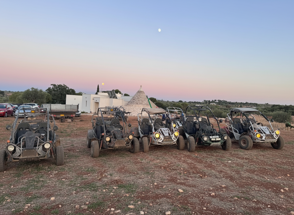 Les campagnes autour de Castellana Grotte ne sont pas seulement célèbres pour leurs grottes souterraines : en surface, un réseau de pistes agricoles, d'anciens tratturi (chemins de transhumance) et de sentiers rocailleux serpente à travers des oliveraies, des amandiers et le plateau caractéristique des Murge, avec sa terre rouge et ses murets de pierres sèches. C'est ici que prennent vie les aventures en quad et buggy, menées par des guides locaux qui connaissent chaque virage, chaque point de vue et chaque histoire de ces terres anciennes.